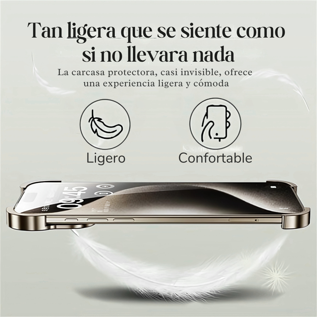 La mayoría de fundas usan plástico barato o marcos pesados que bloquean la señal. MetalShield™ utiliza aleación de aluminio forjado: ultraligera, protectora.